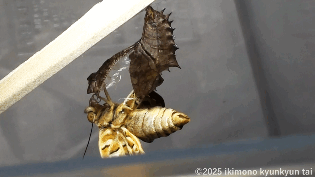 しかしこれが何万年もの間自然界を生き抜いてきたパワーです。自分の脚で蛹の皮を押し、蛹や割り箸に捕まっていく姿はとても逞しく感じました。